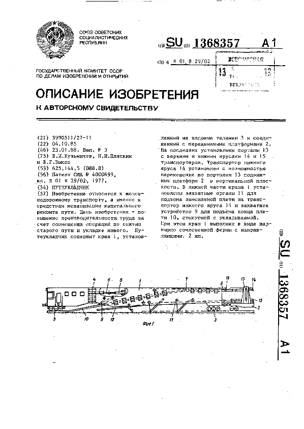 Путеукладчик / Кузьмичев Б. И., Пляскин Н. И., Зыков В. Г. // Описания изобретений (ретрофонд) / Комитет по патентам и товарным знакам России. — М., 1994-____. — (Патенты России). – 1988, № 1. — Загл. с титул. экрана. — Поисковая система: ИПС MIMOSA GTI. — Систем. требования: Acrobat Reader. — Режим доступа: ftp://smolensklib.ru/bd/patent_ru/pt1368357.pdf. — <URL:ftp://smolensklib.ru/bd/patent_ru/pt1368357.pdf>.