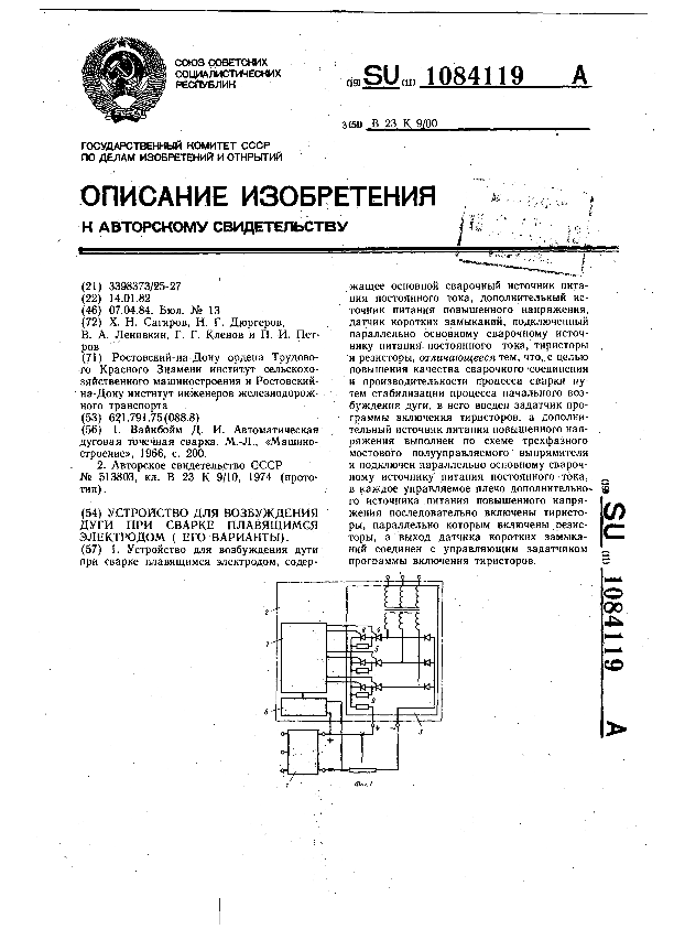 Устройство для возбуждения дуги при сварке плавящимся электродом (его варианты) / Сагиров Х. Н., Дюргеров Н. Г., Ленивкин В. А. [и др.]; заявитель : Ростовский-на-Дону ордена Трудового Красного Знамени институт сельскохозяйственного машиностроения, Ростовский-на-Дону институт инженеров железнодорожного транспорта // Описания изобретений (ретрофонд) / Комитет по патентам и товарным знакам России. – М. — (Патенты России)., 2003. – 1984, № 1. — Загл. с титул. экрана. — Поисковая система: ИПС MIMOSA GTI. — Систем. требования: Acrobat Reader. — Режим доступа: ftp://smolensklib.ru/bd/patent_ru/pt1084119.pdf. — <URL:ftp://smolensklib.ru/bd/patent_ru/pt1084119.pdf>.