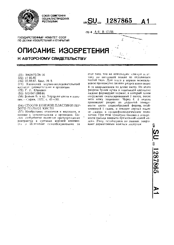 Способ кожной пластики первого пальца кисти / Юдкевич Г. Л.; заявитель: Казанский научно-исследовательский институт травматологии и ортопедии // Описания изобретений (ретрофонд) / Комитет по патентам и товарным знакам России. – М., 2003. – 1987, № 1. — (Патенты России). — Загл. с титул. экрана. — Поисковая система: MIMOSA GTI. — Систем. требования: Acrobat Reader. — Режим доступа: ftp://smolensklib.ru/bd/patent_ru/pt1287865.pdf. — <URL:ftp://smolensklib.ru/bd/patent_ru/pt1287865.pdf>.