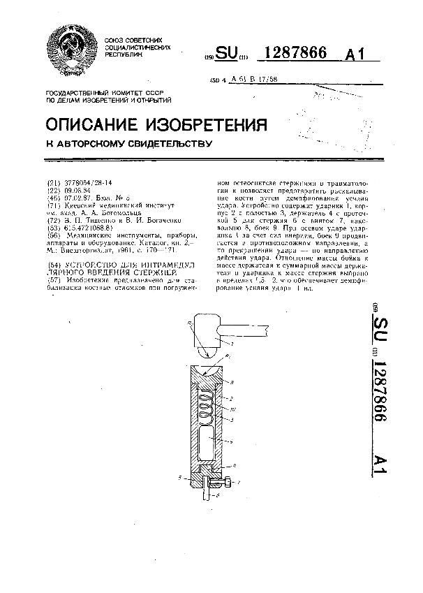 Устройство для интрамедуллярного введения стержней / Тищенко В. П., Богаченко В. И.; заявитель: Киевский медицинский институт им. акад. А. А. Богомольца // Описания изобретений (ретрофонд) / Комитет по патентам и товарным знакам России. – М., 2003. – 1987, № 1. — (Патенты России). — Загл. с титул. экрана. — Поисковая система: MIMOSA GTI. — Систем. требования: Acrobat Reader. — Режим доступа: ftp://smolensklib.ru/bd/patent_ru/pt1287866.pdf. — <URL:ftp://smolensklib.ru/bd/patent_ru/pt1287866.pdf>.