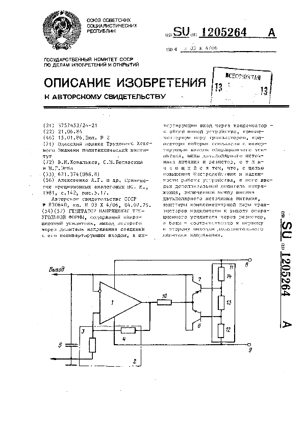 Генератор напряжения треугольной формы / Ковальков В. И., Белявский С. М., Эшба М. Г.; заявитель: Одесский ордена Трудового Красного Знамени политехнический институт // Описания изобретений (ретрофонд) / Комитет по патентам и товарным знакам России. – М., 2003. – 1986, № 1. — (Патенты России). — Загл. с титул. экрана. — Поисковая система: ИПС MIMOSA GTI. — Систем. требования: Acrobat Reader. — Режим доступа: ftp://smolensklib.ru/bd/patent_ru/pt1205264.pdf. — <URL:ftp://smolensklib.ru/bd/patent_ru/pt1205264.pdf>.