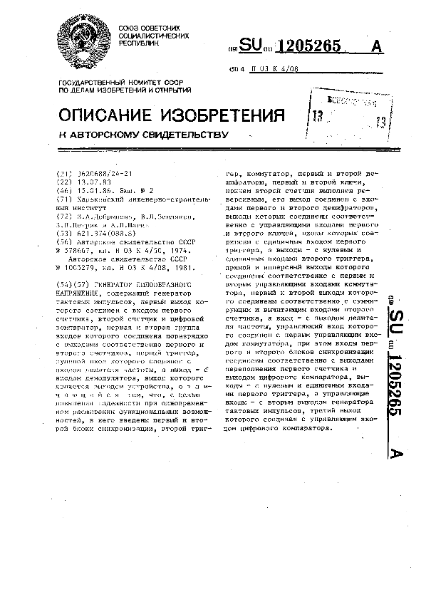 Генератор пилообразного напряжения / Добрыдень В. А., Земляков В. Л., Петрик В. П. [и др.]; заявитель: Харьковский инженерно-строительный институт // Описания изобретений (ретрофонд) / Комитет по патентам и товарным знакам России. – М., 2003. – 1986, № 1. — (Патенты России). — Загл. с титул. экрана. — Поисковая система: ИПС MIMOSA GTI. — Систем. требования: Acrobat Reader. — Режим доступа: ftp://smolensklib.ru/bd/patent_ru/pt1205265.pdf. — <URL:ftp://smolensklib.ru/bd/patent_ru/pt1205265.pdf>.