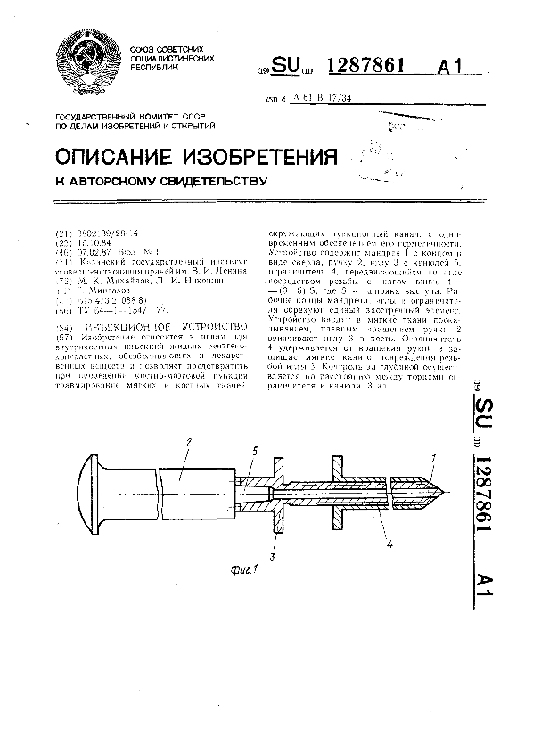 Инъекционное устройство / Михайлов М. К., Никошин Л. И., Мингазов Р. Г.; заявитель: Казанский государственный институт усовершенствования врачей им. В. И. Ленина // Описания изобретений (ретрофонд) / Комитет по патентам и товарным знакам России. – М., 2003. – 1987, № 1. — (Патенты России). — Загл. с титул. экрана. — Поисковая система: MIMOSA GTI. — Систем. требования: Acrobat Reader. — Режим доступа: ftp://smolensklib.ru/bd/patent_ru/pt1287861.pdf. — <URL:ftp://smolensklib.ru/bd/patent_ru/pt1287861.pdf>.