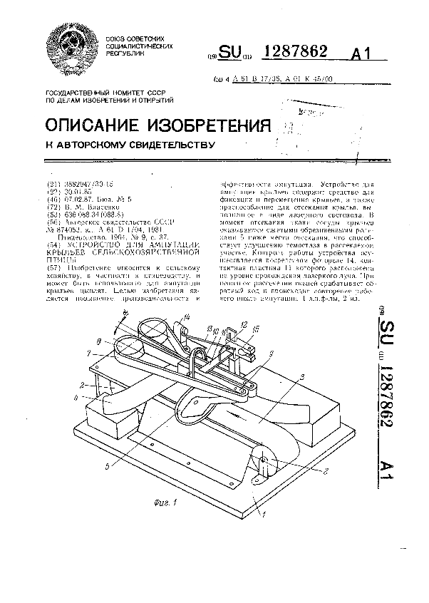 Устройство для ампутации крыльев сельскохозяйственной птицы / Власенко В. М. // Описания изобретений (ретрофонд) / Комитет по патентам и товарным знакам России. – М., 2003. – 1987, № 1. — (Патенты России). — Загл. с титул. экрана. — Поисковая система: MIMOSA GTI. — Систем. требования: Acrobat Reader. — Режим доступа: ftp://smolensklib.ru/bd/patent_ru/pt1287862.pdf. — <URL:ftp://smolensklib.ru/bd/patent_ru/pt1287862.pdf>.