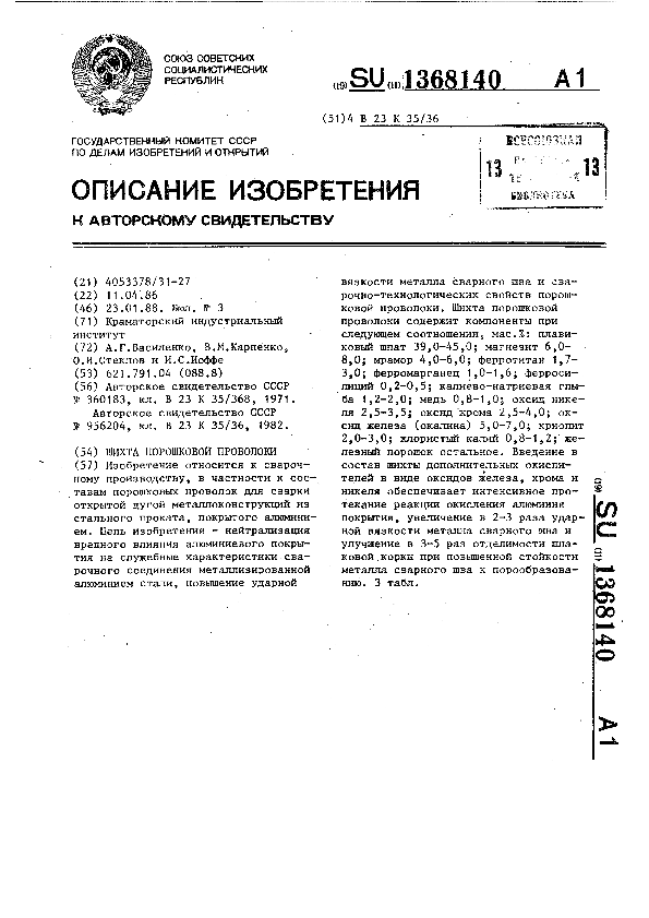 Шихта порошковой проволоки / Василенко А. Г., Карпенко В. М., Стеклов О. И., Иоффе И. С.; заявитель: Краматорский индустриальный институт // Описания изобретений (ретрофонд) / Комитет по патентам и товарным знакам России. — М., 1994-____. — (Патенты России). – 1988, № 1. — Загл. с титул. экрана. — Поисковая система: ИПС MIMOSA GTI. — Систем. требования: Acrobat Reader. — Режим доступа: ftp://smolensklib.ru/bd/patent_ru/pt1368140.pdf. — <URL:ftp://smolensklib.ru/bd/patent_ru/pt1368140.pdf>.