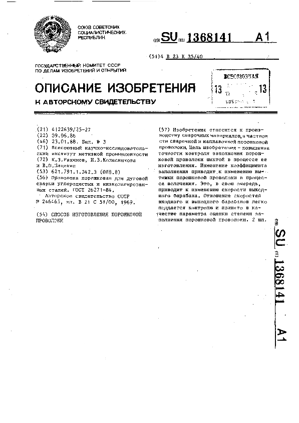 Способ изготовления порошковой проволоки / Рахимов К. 3., Колесникова И. В., Пацекин В. П.; заявитель: Всесоюзный научно-исследовательский институт метизной промышленности // Описания изобретений (ретрофонд) / Комитет по патентам и товарным знакам России. — М., 1994-____. — (Патенты России). – 1988, № 1. — Загл. с титул. экрана. — Поисковая система: ИПС MIMOSA GTI. — Систем. требования: Acrobat Reader. — Режим доступа: ftp://smolensklib.ru/bd/patent_ru/pt1368141.pdf. — <URL:ftp://smolensklib.ru/bd/patent_ru/pt1368141.pdf>.