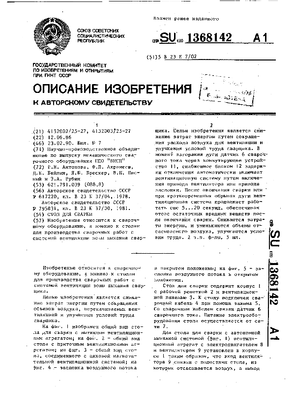 Стол для сварки / Антонова Р. Н., Ахрамеев Ф. П., Бейлин Д. Е. [и др.]; заявитель: Научно-производственное объединение по выпуску механического сварочного оборудования НПО "ВИСП" // Описания изобретений (ретрофонд) / Комитет по патентам и товарным знакам России. — М., 1994-____. — (Патенты России). – 1988, № 1. — Загл. с титул. экрана. — Поисковая система: ИПС MIMOSA GTI. — Систем. требования: Acrobat Reader. — Режим доступа: ftp://smolensklib.ru/bd/patent_ru/pt1368142.pdf. — <URL:ftp://smolensklib.ru/bd/patent_ru/pt1368142.pdf>.