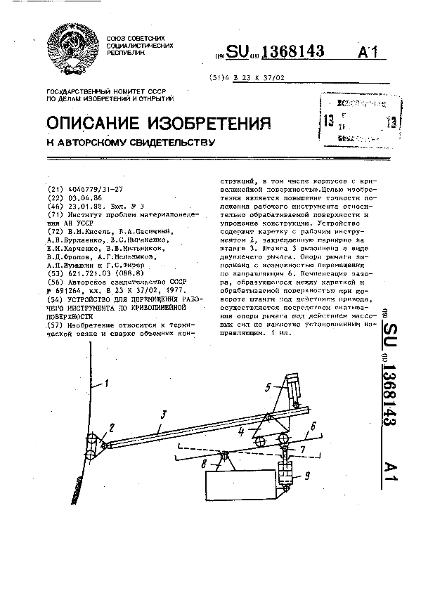 Устройство для перемещения рабочего инструмента по криволинейной поверхности / Кисель В. М., Пасичный В. В., Бурлаенко А. В. [и др.]; заявитель: Институт проблем материаловедения АН УССР // Описания изобретений (ретрофонд) / Комитет по патентам и товарным знакам России. — М., 1994-____. — (Патенты России). – 1988, № 1. — Загл. с титул. экрана. — Поисковая система: ИПС MIMOSA GTI. — Систем. требования: Acrobat Reader. — Режим доступа: ftp://smolensklib.ru/bd/patent_ru/pt1368143.pdf. — <URL:ftp://smolensklib.ru/bd/patent_ru/pt1368143.pdf>.