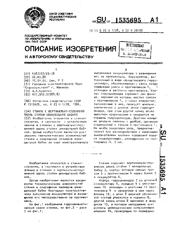 Станок с вертикально-подвижной вдоль стойки шпиндельной бабкой / Бумагин А. А.; заявитель: Головное конструкторское бюро "Станкосистема" г . Иваново // Описания изобретений (ретрофонд) / Комитет по патентам и товарным знакам России. – М., 2003. – 1990, № 1. — (Патенты России). — Загл. с титул. экрана. — Поисковая система: MIMOSA GTI. — Систем. требования: Acrobat Reader. — Режим доступа: ftp://smolensklib.ru/bd/patent_ru/pt1535695.pdf. — <URL:ftp://smolensklib.ru/bd/patent_ru/pt1535695.pdf>.