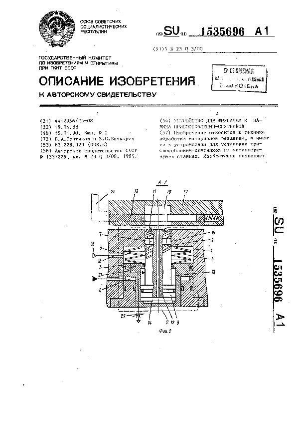 Устройство для фиксации и зажима приспособлений-спутников / Сентяков Б. А., Бочкарев В. С. // Описания изобретений (ретрофонд) / Комитет по патентам и товарным знакам России. – М., 2003. – 1990, № 1. — (Патенты России). — Загл. с титул. экрана. — Поисковая система: MIMOSA GTI. — Систем. требования: Acrobat Reader. — Режим доступа: ftp://smolensklib.ru/bd/patent_ru/pt1535696.pdf. — <URL:ftp://smolensklib.ru/bd/patent_ru/pt1535696.pdf>.