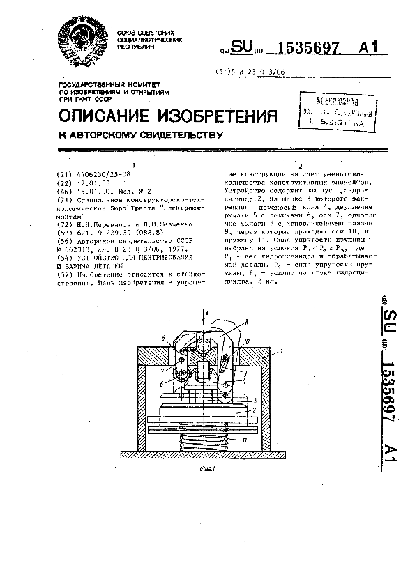 Устройство для центрирования и зажима деталей / Перевалов Н. Н., Шевченко Л. И.; заявитель: Специальное конструкторско-технологическое бюро Треста "Электроюжмонтаж" // Описания изобретений (ретрофонд) / Комитет по патентам и товарным знакам России. – М., 2003. – 1990, № 1. — (Патенты России). — Загл. с титул. экрана. — Поисковая система: MIMOSA GTI. — Систем. требования: Acrobat Reader. — Режим доступа: ftp://smolensklib.ru/bd/patent_ru/pt1535697.pdf. — <URL:ftp://smolensklib.ru/bd/patent_ru/pt1535697.pdf>.