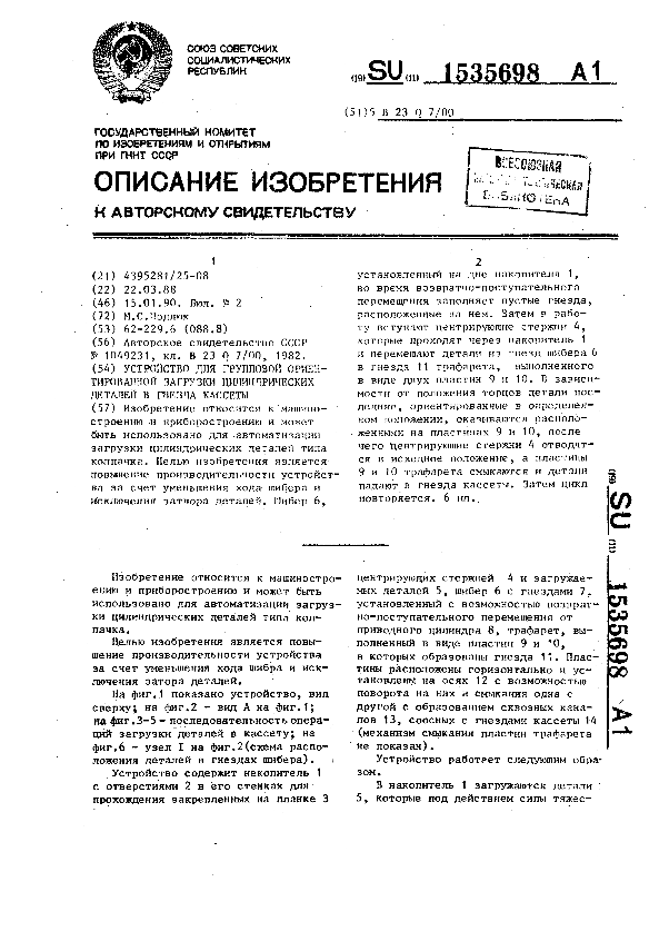 Устройство для групповой ориентированной загрузки цилиндрических деталей в гнезда кассеты / Подлюк М. С. // Описания изобретений (ретрофонд) / Комитет по патентам и товарным знакам России. – М., 2003. – 1990, № 1. — (Патенты России). — Загл. с титул. экрана. — Поисковая система: MIMOSA GTI. — Систем. требования: Acrobat Reader. — Режим доступа: ftp://smolensklib.ru/bd/patent_ru/pt1535698.pdf. — <URL:ftp://smolensklib.ru/bd/patent_ru/pt1535698.pdf>.