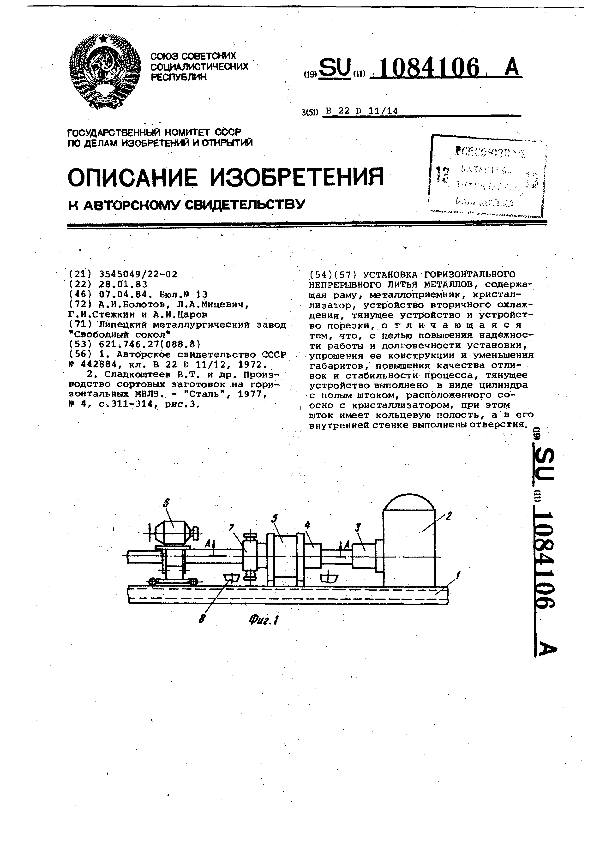 Установка горизонтального неприрывного литья металлов / Болотов А. И., Мицевич Л. А., Стежкин Г. И., Царев А. И.; заявитель : Липецкий металлургический завод "Свободный сокол" // Описания изобретений (ретрофонд) / Комитет по патентам и товарным знакам России. – М. — (Патенты России)., 2003. – 1984, № 1. — Загл. с титул. экрана. — Поисковая система: ИПС MIMOSA GTI. — Систем. требования: Acrobat Reader. — Режим доступа: ftp://smolensklib.ru/bd/patent_ru/pt1084106.pdf. — <URL:ftp://smolensklib.ru/bd/patent_ru/pt1084106.pdf>.