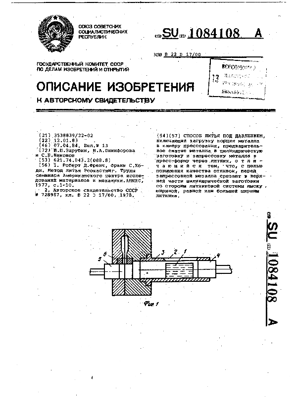 Способ литья под давлением / Зарубин П. П., Никифорова Н. А., Никонов С. Е. // Описания изобретений (ретрофонд) / Комитет по патентам и товарным знакам России. – М. — (Патенты России)., 2003. – 1984, № 1. — Загл. с титул. экрана. — Поисковая система: ИПС MIMOSA GTI. — Систем. требования: Acrobat Reader. — Режим доступа: ftp://smolensklib.ru/bd/patent_ru/pt1084108.pdf. — <URL:ftp://smolensklib.ru/bd/patent_ru/pt1084108.pdf>.