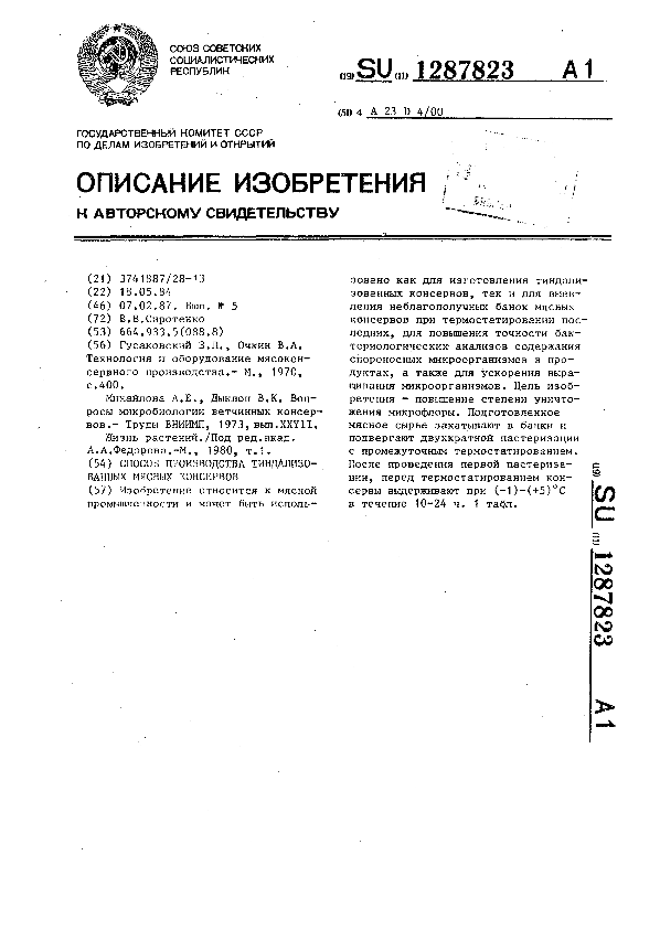 Способ производства тиндализованных мясных консервов / Сиротенко В. В. // Описания изобретений (ретрофонд) / Комитет по патентам и товарным знакам России. – М., 2003. – 1987, № 1. — (Патенты России). — Загл. с титул. экрана. — Поисковая система: MIMOSA GTI. — Систем. требования: Acrobat Reader. — Режим доступа: ftp://smolensklib.ru/bd/patent_ru/pt1287823.pdf. — <URL:ftp://smolensklib.ru/bd/patent_ru/pt1287823.pdf>.
