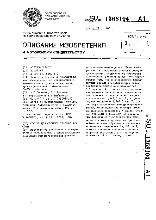 Состав для обсыпки оболочковых форм / Сорокин А. С., Гращенко Е. Н., Трубченко В. П., Тимашкова В. В.; заявитель: Брянское научно-производственное объединение по механизации и автоматизации производства Научно- производственного объединения «ВКТИстройдормаш» // Описания изобретений (ретрофонд) / Комитет по патентам и товарным знакам России. — М., 1994-____. — (Патенты России). – 1988, № 1. — Загл. с титул. экрана. — Поисковая система: ИПС MIMOSA GTI. — Систем. требования: Acrobat Reader. — Режим доступа: ftp://smolensklib.ru/bd/patent_ru/pt1368104.pdf. — <URL:ftp://smolensklib.ru/bd/patent_ru/pt1368104.pdf>.
