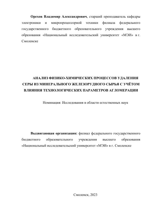 Орехов, Владимир Александрович. Анализ физико-химических процессов удаления серы из минерального железорудного сырья с учетом влияния технологических параметров агломерации / Орехов В. А.; Фил. Федер. гос. бюджет. образоват. учр. высш. образования "Национальный исследовательский университет "МЭИ" в г. Смоленске. — Смоленск, 2023. — 30 с.: ил., табл. — (Номинация: Исследования в области естественных наук). — Систем. требования: Acrobat Reader. — Режим доступа: ftp://smolensklib.ru/bd/smol_uch/u00001096.pdf. — <URL:ftp://smolensklib.ru/bd/smol_uch/u00001096.pdf>.