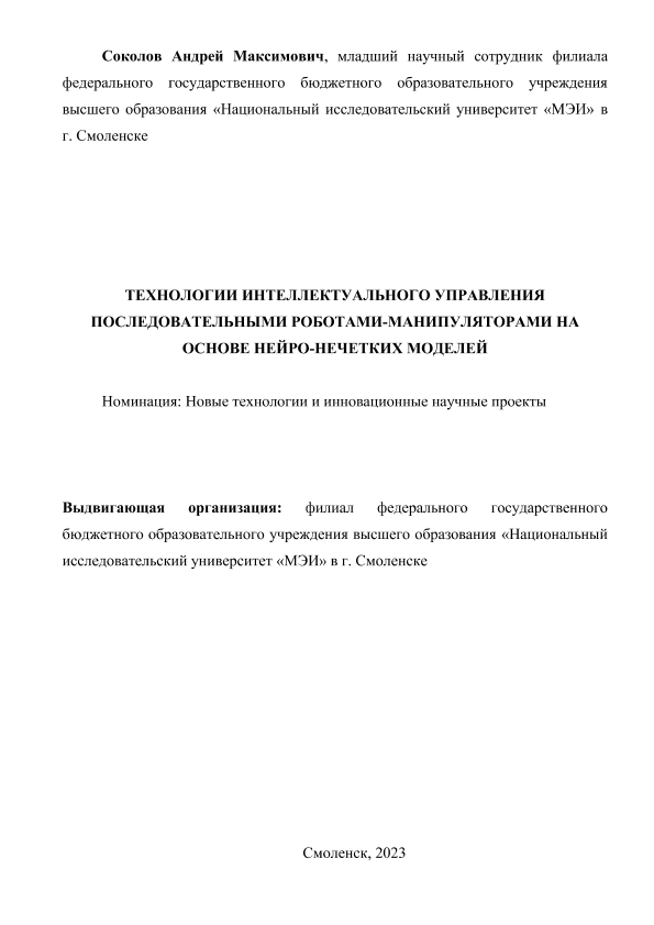 Соколов, Андрей Максимович. Технологии интеллектуального управления последовательными роботами-манипуляторами на основе нейро-нечетких моделей / Соколов А. М.; Фил. Федер. гос. бюджет. образоват. учр. высш. образования "Национальный исследовательский университет "МЭИ" в г. Смоленске. — Смоленск, 2023. — 30 с.: ил., табл. — (Номинация: Новые технологии и инновационные научные проекты). — Систем. требования: Acrobat Reader. — Режим доступа: ftp://smolensklib.ru/bd/smol_uch/u00001097.pdf. — <URL:ftp://smolensklib.ru/bd/smol_uch/u00001097.pdf>.