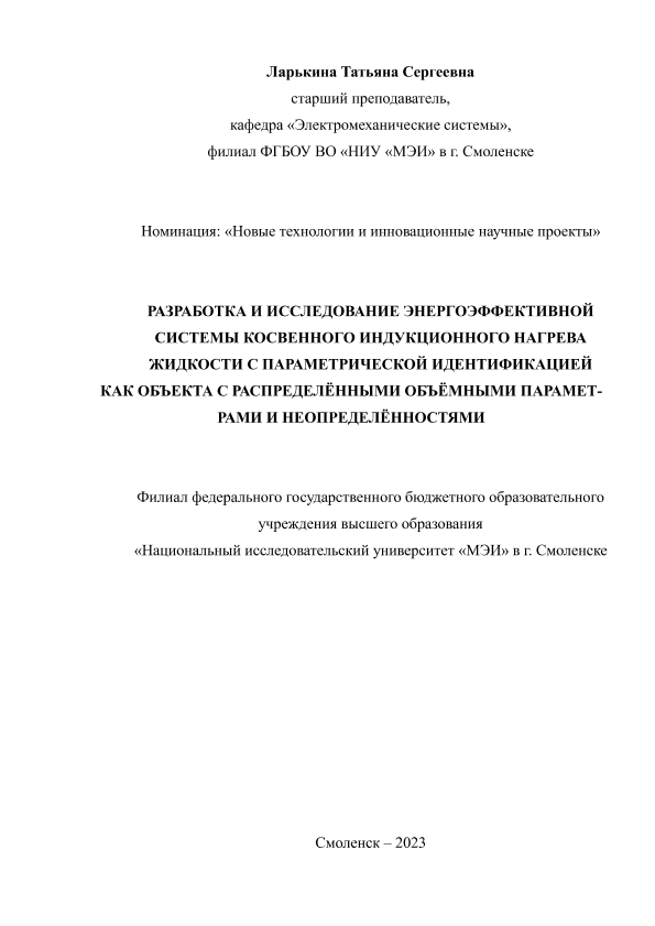 Ларькина, Татьяна Сергеевна. Разработка и исследование энергоэффективной системы косвенного индукционного нагрева жидкости с параметрической идентификацией как объекта с распределёнными объёмными параметрами и неопределённостями / Ларькина Т. С.; [М-во науки и высшего образования Российской Федерации], Фил. Федер. гос. бюджет. образоват. учр. высш. образования "Национальный исследовательский университет "МЭИ" в г. Смоленске, [Каф. "Электромеханические системы"]. — Смоленск, 2023. — 32 с.: ил., цв. ил. — (Номинация: "Новые технологии и инновационные научные проекты"). — Систем. требования: Acrobat Reader. — Режим доступа: ftp://smolensklib.ru/bd/smol_uch/u00001098.pdf. — <URL:ftp://smolensklib.ru/bd/smol_uch/u00001098.pdf>.