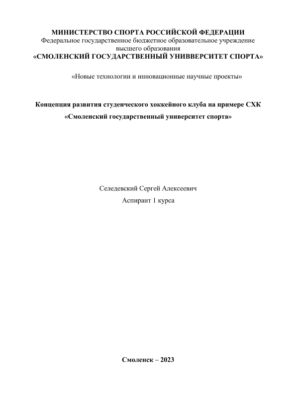 Селедевский, Сергей Алексеевич. Концепция развития студенческого хоккейного клуба на примере СХК "Смоленский государственный университет спорта" / Селедевский С. А.; М-во спорта Российской Федерации, ФГБОУ ВО "Смоленский государственный университет спорта". — Смоленск, 2023. — 26 c.: ил., табл. — (Новые технологии и инновационные научные проекты). — Систем. требования: Acrobat Reader. — Режим доступа: ftp://smolensklib.ru/bd/smol_uch/u00001099.pdf. — <URL:ftp://smolensklib.ru/bd/smol_uch/u00001099.pdf>.