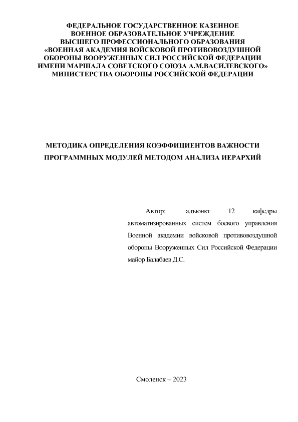 Балабаев, Дмитрий Сергеевич. Методика определения коэффициентов важности программных модулей методом анализа иерархий / Балабаев Д. С.; Федеральное государственное казенное военное образовательное учреждение высшего профессионального образования "Военная академия войсковой противовоздушной обороны Вооруженных Сил Российской Федерации им. маршала Советского Союза А. М. Василевского" Министерства обороны Российской Федерации. — Смоленск, 2023. — 22 с.: ил., табл. — (Номинация: исследования в области технических наук). — Систем. требования: Acrobat Reader. — Режим доступа: ftp://smolensklib.ru/bd/smol_uch/.pdf. — <URL:ftp://smolensklib.ru/bd/smol_uch/u00001100.pdf>.
