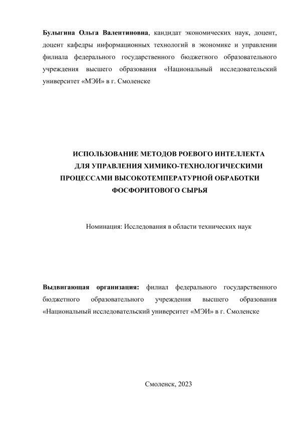 Булыгина, Ольга Валентиновна. Использование методов роевого интеллекта для управления химико-технологическими процессами высокотемпературной обработки фосфоритового сырья / Булыгина О. В.; Фил. Федер. гос. бюджет. образоват. учр. высш. образования "Национальный исследовательский университет "МЭИ" в г. Смоленске. — Смоленск, 2023. — 30 с.: ил., табл. — (Номинация: Исследования в области технических наук). — Систем. требования: Acrobat Reader. — Режим доступа: ftp://smolensklib.ru/bd/smol_uch/.pdf. — <URL:ftp://smolensklib.ru/bd/smol_uch/u00001101.pdf>.