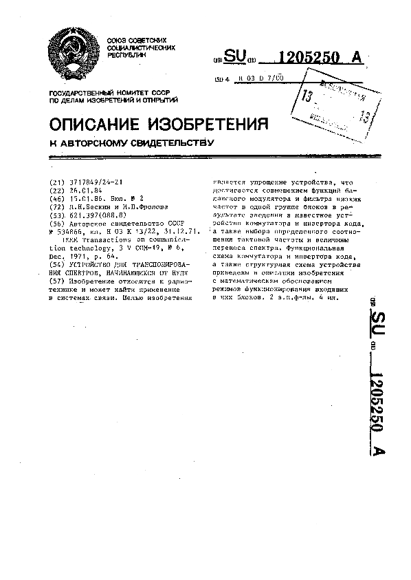 Устройство для транспортирования спектров, начинающихся от нуля / Бескин Л. Н., Фролова И. П. // Описания изобретений (ретрофонд) / Комитет по патентам и товарным знакам России. – М., 2003. – 1986, № 1. — (Патенты России). — Загл. с титул. экрана. — Поисковая система: ИПС MIMOSA GTI. — Систем. требования: Acrobat Reader. — Режим доступа: ftp://smolensklib.ru/bd/patent_ru/pt1205250.pdf. — <URL:ftp://smolensklib.ru/bd/patent_ru/pt1205250.pdf>.
