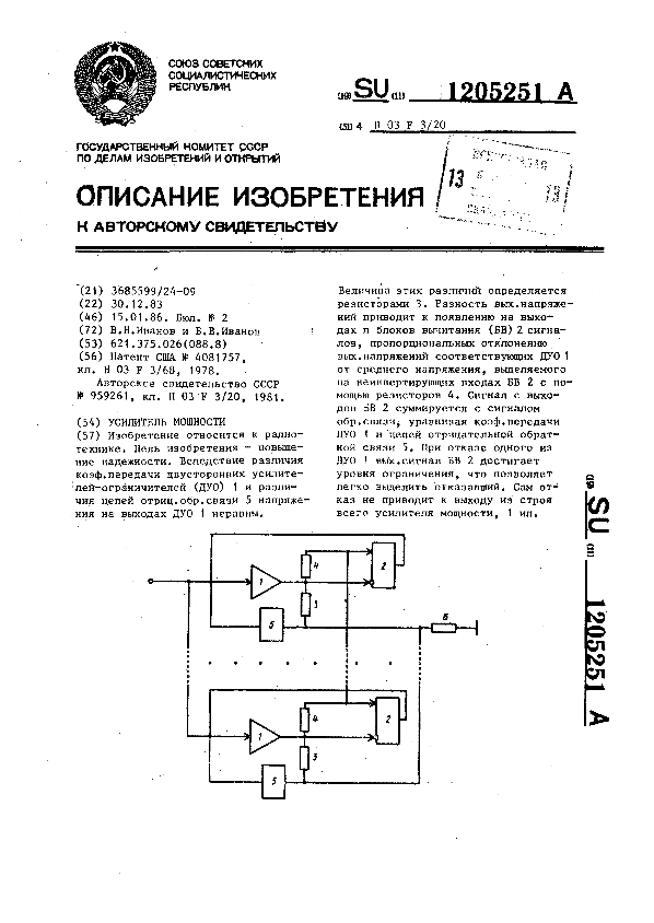 Усилитель мощности / Иванов В. Н., Иванов В. В. // Описания изобретений (ретрофонд) / Комитет по патентам и товарным знакам России. – М., 2003. – 1986, № 1. — (Патенты России). — Загл. с титул. экрана. — Поисковая система: ИПС MIMOSA GTI. — Систем. требования: Acrobat Reader. — Режим доступа: ftp://smolensklib.ru/bd/patent_ru/pt1205251.pdf. — <URL:ftp://smolensklib.ru/bd/patent_ru/pt1205251.pdf>.