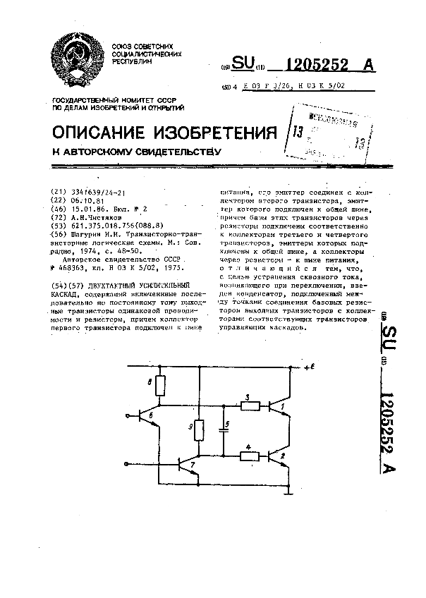 Двухтактный усилительный каскад / Чистяков А. Н. // Описания изобретений (ретрофонд) / Комитет по патентам и товарным знакам России. – М., 2003. – 1986, № 1. — (Патенты России). — Загл. с титул. экрана. — Поисковая система: ИПС MIMOSA GTI. — Систем. требования: Acrobat Reader. — Режим доступа: ftp://smolensklib.ru/bd/patent_ru/pt1205252.pdf. — <URL:ftp://smolensklib.ru/bd/patent_ru/pt1205252.pdf>.
