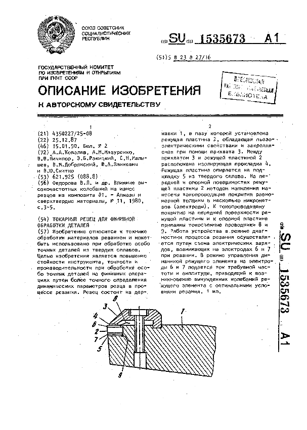 Токарный резец для финишной обработки деталей / Ковалев А. А., Мазуренко А. М., Ничипор В. В. [и др.] // Описания изобретений (ретрофонд) / Комитет по патентам и товарным знакам России. – М., 2003. – 1990, № 1. — (Патенты России). — Загл. с титул. экрана. — Поисковая система: MIMOSA GTI. — Систем. требования: Acrobat Reader. — Режим доступа: ftp://smolensklib.ru/bd/patent_ru/pt1535673.pdf. — <URL:ftp://smolensklib.ru/bd/patent_ru/pt1535673.pdf>.