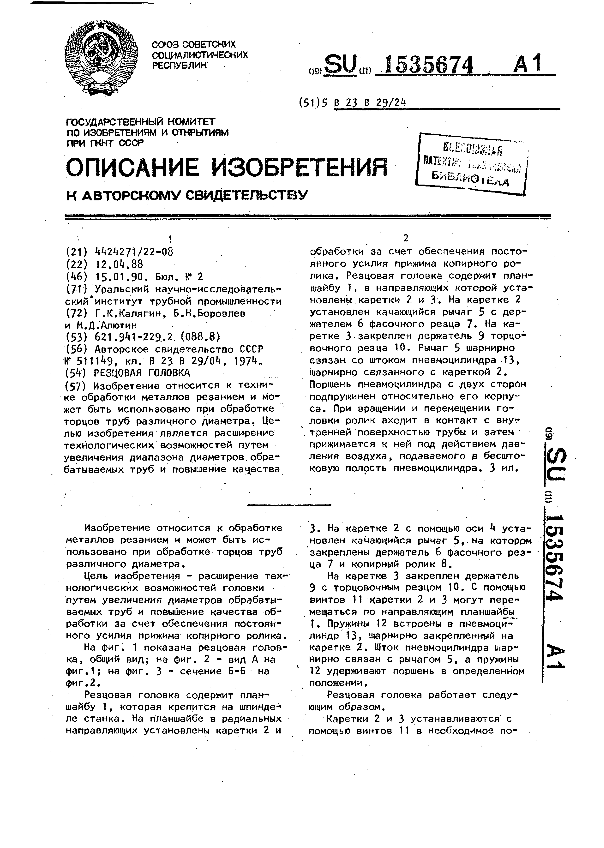 Резцовая головка / Калягин Г. К., Боровлев Б. Н., Алютин М. Д.; заявитель: Уральский научно-исследовательский институт трубной промышленности // Описания изобретений (ретрофонд) / Комитет по патентам и товарным знакам России. – М., 2003. – 1990, № 1. — (Патенты России). — Загл. с титул. экрана. — Поисковая система: MIMOSA GTI. — Систем. требования: Acrobat Reader. — Режим доступа: ftp://smolensklib.ru/bd/patent_ru/pt1535674.pdf. — <URL:ftp://smolensklib.ru/bd/patent_ru/pt1535674.pdf>.