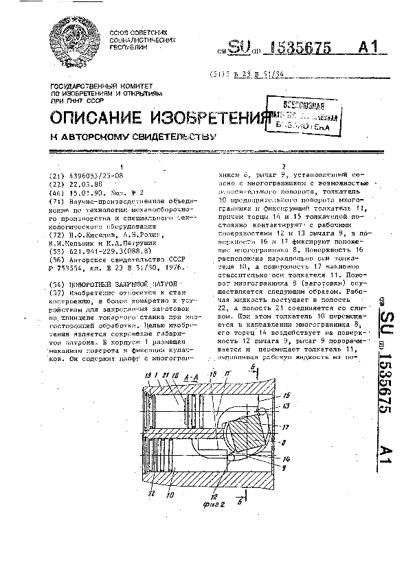 Поворотный зажимной патрон / Киселев Н. Ф., Родин А. Н., Мельник В. И., Петрушин И. А.; заявитель: Научно-производственное объединение по технологии механосборочного производства и специального технологического оборудования // Описания изобретений (ретрофонд) / Комитет по патентам и товарным знакам России. – М., 2003. – 1990, № 1. — (Патенты России). — Загл. с титул. экрана. — Поисковая система: MIMOSA GTI. — Систем. требования: Acrobat Reader. — Режим доступа: ftp://smolensklib.ru/bd/patent_ru/pt1535675.pdf. — <URL:ftp://smolensklib.ru/bd/patent_ru/pt1535675.pdf>.