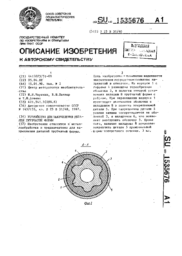 Устройство для закрепления деталей трубчатой формы / Терехин И. И., Батлер В. Ш., Агеева Т. Н.; заявитель: Центр методологии изобретательства // Описания изобретений (ретрофонд) / Комитет по патентам и товарным знакам России. – М., 2003. – 1990, № 1. — (Патенты России). — Загл. с титул. экрана. — Поисковая система: MIMOSA GTI. — Систем. требования: Acrobat Reader. — Режим доступа: ftp://smolensklib.ru/bd/patent_ru/pt1535676.pdf. — <URL:ftp://smolensklib.ru/bd/patent_ru/pt1535676.pdf>.