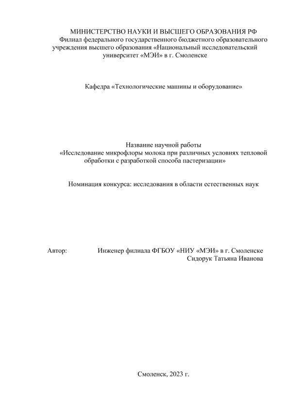Сидорук, Никита Михайлович. Исследование микрофлоры молока при различных условиях тепловой обработки с разработкой способа пастеризации / Сидорук Т. И.; М-во науки и высшего образования РФ, Фил. Федер. гос. бюджет. образоват. учр. высш. образования "Национальный исследовательский университет "МЭИ" в г. Смоленске, Каф. "Технологические машины и оборудование". — Смоленск, 2023. — 18 с.: ил., табл. — (Номинация конкурса: Исследования в области естественных наук). — Систем. требования: Acrobat Reader. — Режим доступа: ftp://smolensklib.ru/bd/smol_uch/u00001094.pdf. — <URL:ftp://smolensklib.ru/bd/smol_uch/u00001094.pdf>.