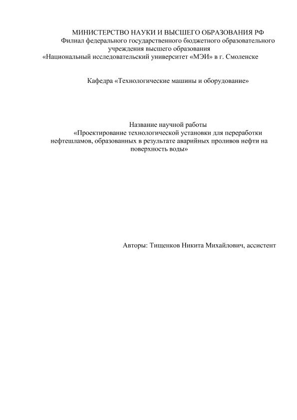 Тищенков, Никита Михайлович. Проектирование технологической установки для переработки нефтешламов, образованных в результате аварийных проливов нефти на поверхность воды / Тищенков Н. М.; М-во науки и высшего образования РФ, Фил. Федер. гос. бюджет. образоват. учр. высш. образования "Национальный исследовательский университет "МЭИ" в г. Смоленске, Каф. "Технологические машины и оборудование". — Смоленск, 2023. — 21 с.: ил., табл. — (Номинация конкурса: Исследования в области естественных наук). — Систем. требования: Acrobat Reader. — Режим доступа: ftp://smolensklib.ru/bd/smol_uch/u00001095.pdf. — <URL:ftp://smolensklib.ru/bd/smol_uch/u00001095.pdf>.