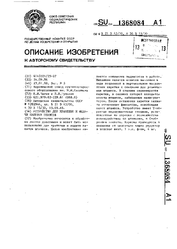 Устройство для хранения и выдачи пакетов штампов / Чагин Б. И., Гунькин Л. И.; заявитель: Воронежский завод кузнечно-прессового оборудования им. М. И. Калинина // Описания изобретений (ретрофонд) / Комитет по патентам и товарным знакам России. — М., 1994-____. — (Патенты России). – 1988, № 1. — Загл. с титул. экрана. — Поисковая система: ИПС MIMOSA GTI. — Систем. требования: Acrobat Reader. — Режим доступа: ftp://smolensklib.ru/bd/patent_ru/pt1368084.pdf. — <URL:ftp://smolensklib.ru/bd/patent_ru/pt1368084.pdf>.