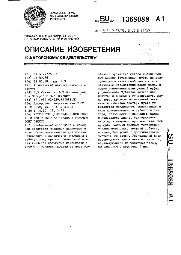 Устройство для подачи полосового и ленточного материала в рабочую зону пресса / Манжосов В. К., Филиповский В. П., Сабиров Х. А., Шишенин С. В.; заявитель: Фрунзенский политехнический институт // Описания изобретений (ретрофонд) / Комитет по патентам и товарным знакам России. — М., 1994-____. — (Патенты России). – 1988, № 1. — Загл. с титул. экрана. — Поисковая система: ИПС MIMOSA GTI. — Систем. требования: Acrobat Reader. — Режим доступа: ftp://smolensklib.ru/bd/patent_ru/pt1368088.pdf. — <URL:ftp://smolensklib.ru/bd/patent_ru/pt1368088.pdf>.