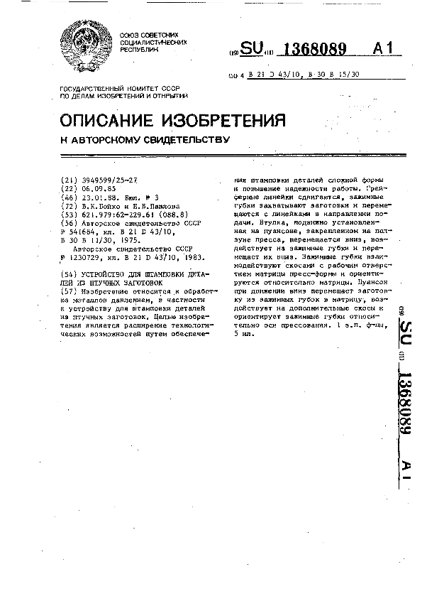 Устройство для штамповки деталей из штучных заготовок / Бойко В. К., Павлова Е. В. // Описания изобретений (ретрофонд) / Комитет по патентам и товарным знакам России. — М., 1994-____. — (Патенты России). – 1988, № 1. — Загл. с титул. экрана. — Поисковая система: ИПС MIMOSA GTI. — Систем. требования: Acrobat Reader. — Режим доступа: ftp://smolensklib.ru/bd/patent_ru/pt1368089.pdf. — <URL:ftp://smolensklib.ru/bd/patent_ru/pt1368089.pdf>.
