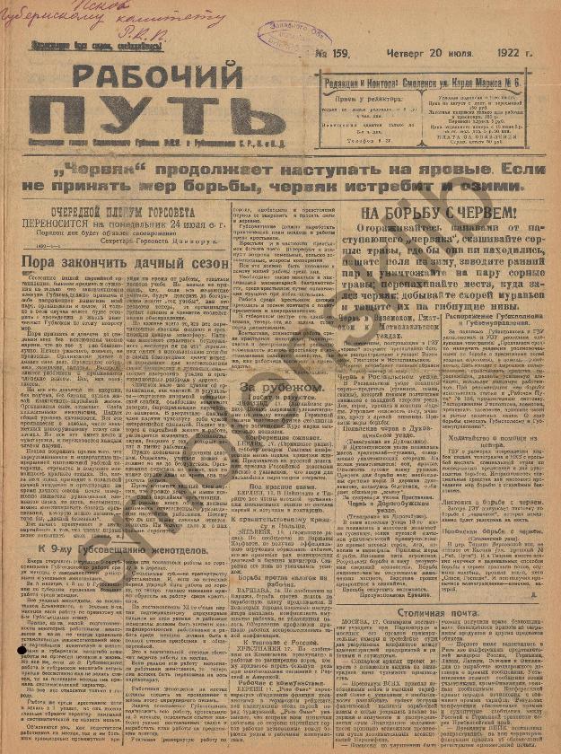 Рабочий путь / Орган Смоленского Губернского Комитета РКП(б) и Губисполкома Советов РК и КД. — Смоленск: 2-я тип. Совнархоза, 1920-____. № 159.