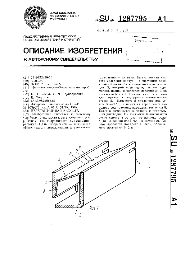 Вегетационная кассета / Габель Б. В., Чернобровкин С. Л., Федотова Л. В.; заявитель: Институт медико-биологических проблем // Описания изобретений (ретрофонд) / Комитет по патентам и товарным знакам России. – М., 2003. – 1987, № 1. — (Патенты России). — Загл. с титул. экрана. — Поисковая система: MIMOSA GTI. — Систем. требования: Acrobat Reader. — Режим доступа: ftp://smolensklib.ru/bd/patent_ru/pt1287795.pdf. — <URL:ftp://smolensklib.ru/bd/patent_ru/pt1287795.pdf>.