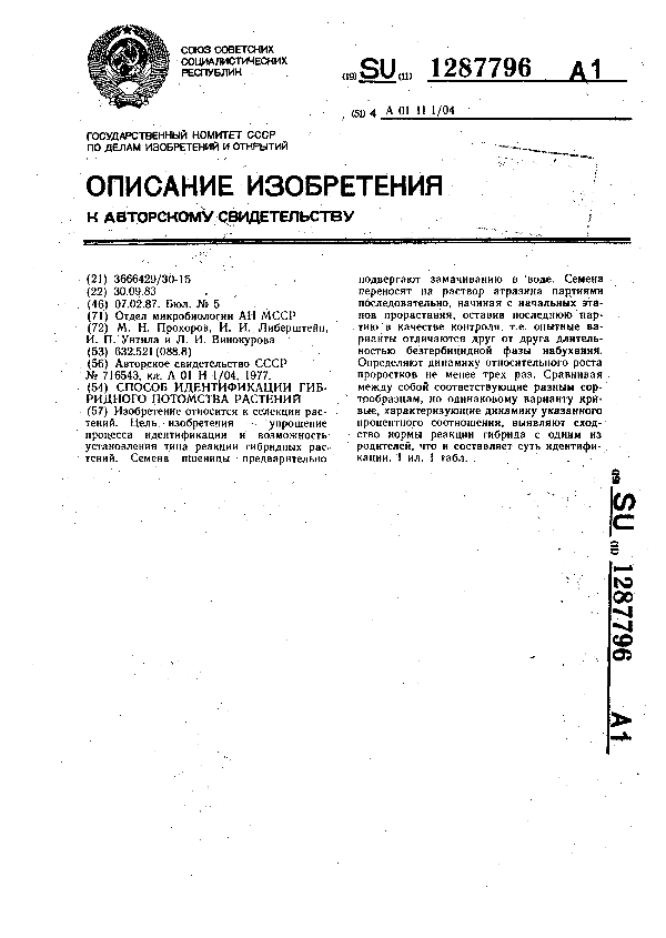 Способ идентификации гибридного потомства растений / Прохоров М. Н., Либерштейн И. И., Унтила И. П., Винокурова Л. И.; заявитель: Отдел микробиологии АН МССР // Описания изобретений (ретрофонд) / Комитет по патентам и товарным знакам России. – М., 2003. – 1987, № 1. — (Патенты России). — Загл. с титул. экрана. — Поисковая система: MIMOSA GTI. — Систем. требования: Acrobat Reader. — Режим доступа: ftp://smolensklib.ru/bd/patent_ru/pt1287796.pdf. — <URL:ftp://smolensklib.ru/bd/patent_ru/pt1287796.pdf>.
