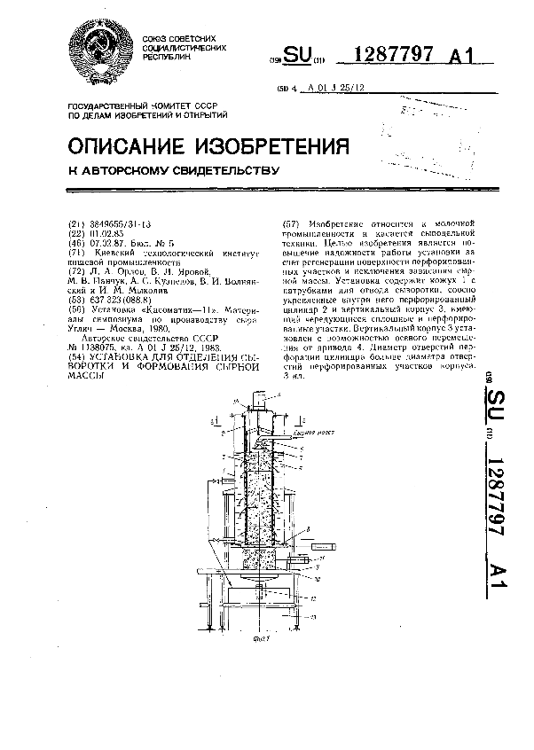 Установка для отделения сыворотки и формования сырной массы / Орлов Л. А., Яровой В. Л., Панчук М. В. [и др.]; заявитель: Киевский технологический институт пищевой промышленности // Описания изобретений (ретрофонд) / Комитет по патентам и товарным знакам России. – М., 2003. – 1987, № 1. — (Патенты России). — Загл. с титул. экрана. — Поисковая система: MIMOSA GTI. — Систем. требования: Acrobat Reader. — Режим доступа: ftp://smolensklib.ru/bd/patent_ru/pt1287797.pdf. — <URL:ftp://smolensklib.ru/bd/patent_ru/pt1287797.pdf>.