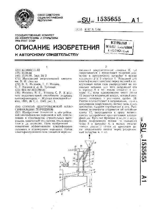 Способ центробежной классификации порошков / Мизонов В. Е., Михеев Г. Г., Ушаков С. Г., Тупицын Д. В.; заявитель: Ивановский энергетический институт им. В. И. Ленина // Описания изобретений (ретрофонд) / Комитет по патентам и товарным знакам России. – М., 2003. – 1990, № 1. — (Патенты России). — Загл. с титул. экрана. — Поисковая система: MIMOSA GTI. — Систем. требования: Acrobat Reader. — Режим доступа: ftp://smolensklib.ru/bd/patent_ru/pt1535655.pdf. — <URL:ftp://smolensklib.ru/bd/patent_ru/pt1535655.pdf>.