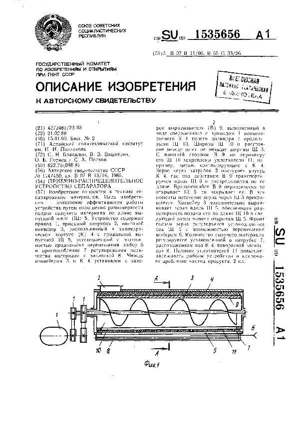 Приемно-распределительное устройство сепаратора / Брасалин С. Н., Вашкевич В. В., Горнец О. Б., Попков С. А.; заявитель: Алтайский политехнический институт им. И. И. Ползунова // Описания изобретений (ретрофонд) / Комитет по патентам и товарным знакам России. – М., 2003. – 1990, № 1. — (Патенты России). — Загл. с титул. экрана. — Поисковая система: MIMOSA GTI. — Систем. требования: Acrobat Reader. — Режим доступа: ftp://smolensklib.ru/bd/patent_ru/pt1535656.pdf. — <URL:ftp://smolensklib.ru/bd/patent_ru/pt1535656.pdf>.