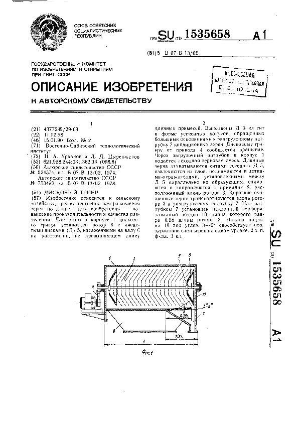 Дисковый триер / Урханов Н. А., Цыренжапов Д. Д.; заявитель: Восточно-Сибирский технологический институт // Описания изобретений (ретрофонд) / Комитет по патентам и товарным знакам России. – М., 2003. – 1990, № 1. — (Патенты России). — Загл. с титул. экрана. — Поисковая система: MIMOSA GTI. — Систем. требования: Acrobat Reader. — Режим доступа: ftp://smolensklib.ru/bd/patent_ru/pt1535658.pdf. — <URL:ftp://smolensklib.ru/bd/patent_ru/pt1535658.pdf>.