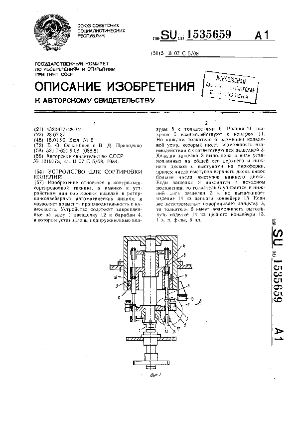 Устройство для сортировки изделий / Оспанбаев Б. О., Приходько В. Д. // Описания изобретений (ретрофонд) / Комитет по патентам и товарным знакам России. – М., 2003. – 1990, № 1. — (Патенты России). — Загл. с титул. экрана. — Поисковая система: MIMOSA GTI. — Систем. требования: Acrobat Reader. — Режим доступа: ftp://smolensklib.ru/bd/patent_ru/pt1535659.pdf. — <URL:ftp://smolensklib.ru/bd/patent_ru/pt1535659.pdf>.