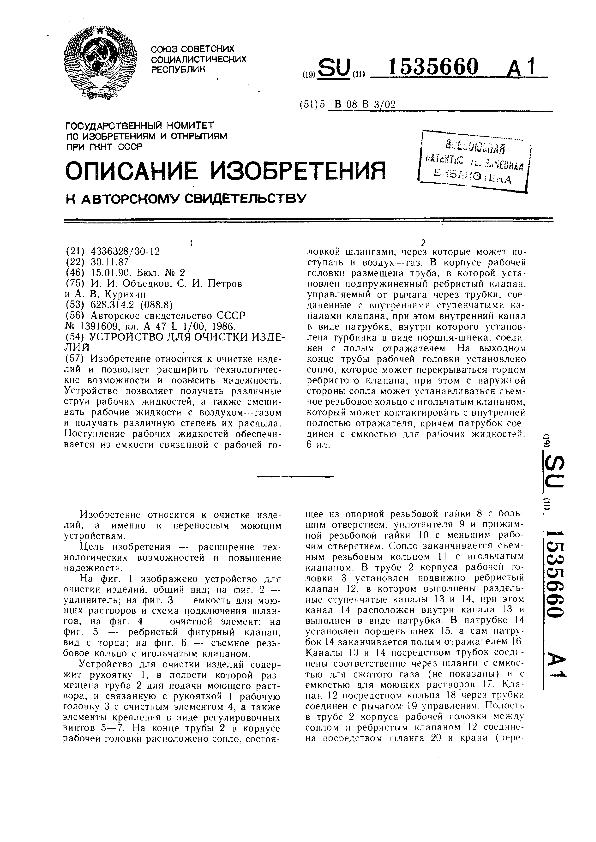Устройство для очистки изделий / Объедков И. И., Петров С. И., Курихин А. В. // Описания изобретений (ретрофонд) / Комитет по патентам и товарным знакам России. – М., 2003. – 1990, № 1. — (Патенты России). — Загл. с титул. экрана. — Поисковая система: MIMOSA GTI. — Систем. требования: Acrobat Reader. — Режим доступа: ftp://smolensklib.ru/bd/patent_ru/pt1535660.pdf. — <URL:ftp://smolensklib.ru/bd/patent_ru/pt1535660.pdf>.