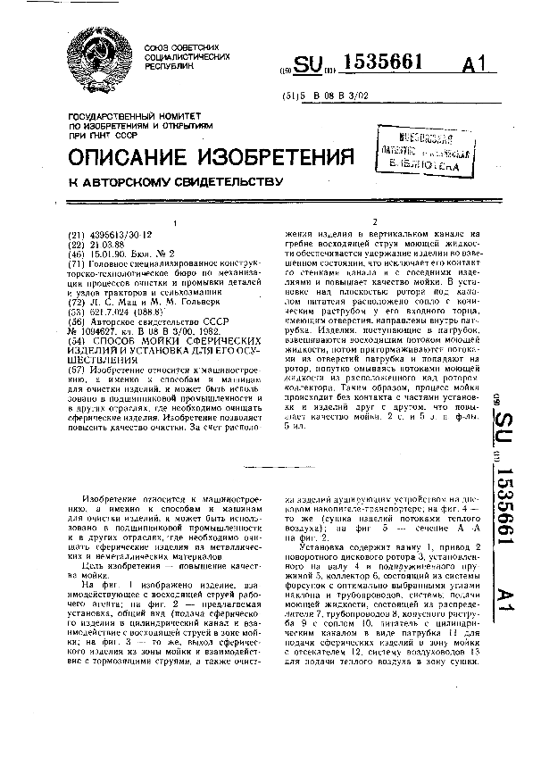 Способ мойки сферических изделий и установка для его осуществления / Мац Л. С., Гольверк М. М.; заявитель: Головное специализированное конструкторско-технологическое бюро по механизации процессов очистки и промывки деталей и узлов тракторов и сельхозмашин // Описания изобретений (ретрофонд) / Комитет по патентам и товарным знакам России. – М., 2003. – 1990, № 1. — (Патенты России). — Загл. с титул. экрана. — Поисковая система: MIMOSA GTI. — Систем. требования: Acrobat Reader. — Режим доступа: ftp://smolensklib.ru/bd/patent_ru/pt1535661.pdf. — <URL:ftp://smolensklib.ru/bd/patent_ru/pt1535661.pdf>.