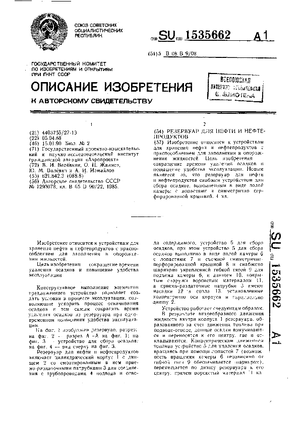 Резервуар для нефти и нефтепродуктов / Веревкин В. И., Жиляев О. Н., Валевич Ю. М., Измайлов А. И.; заявитель: Государственный проектно-изыскательский и научно-исследовательский институт гражданской авиации «Аэропроект» // Описания изобретений (ретрофонд) / Комитет по патентам и товарным знакам России. – М., 2003. – 1990, № 1. — (Патенты России). — Загл. с титул. экрана. — Поисковая система: MIMOSA GTI. — Систем. требования: Acrobat Reader. — Режим доступа: ftp://smolensklib.ru/bd/patent_ru/pt1535662.pdf. — <URL:ftp://smolensklib.ru/bd/patent_ru/pt1535662.pdf>.