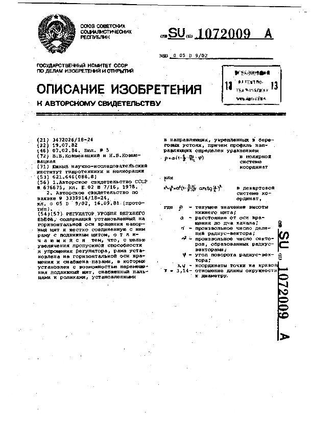 Регулятор уровня верхнего бьефа / Ковшевацкий В. Б., Ковшевацкая И. Б.; заявитель: Южный научно-исследовательский институт гидротехники и мелиорации // Описания изобретений (ретрофонд) / Комитет по патентам и товарным знакам России. – М. — (Патенты России)., 2003. – 1984, № 1. — Загл. с титул. экрана. — Систем. требования: Acrobat Reader. — Режим доступа: ftp://smolensklib.ru/bd/patent_ru/pt1072009.pdf. — <URL:ftp://smolensklib.ru/bd/patent_ru/pt1072009.pdf>.